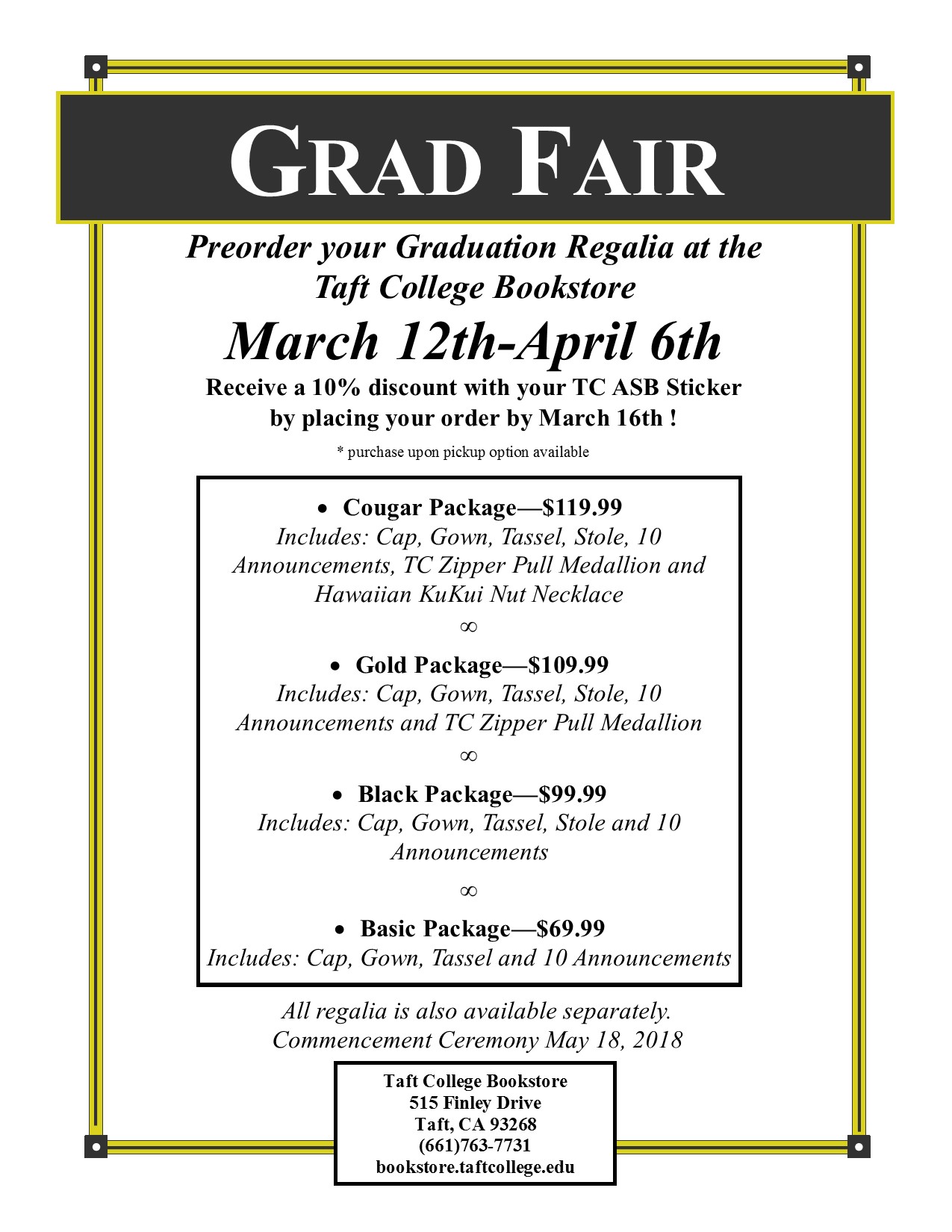 GRAD FAIR kicks off on March 12th – April 6th. Graduating students place your order at the TC Bookstore or online at bookstore.taftcollege.edu.